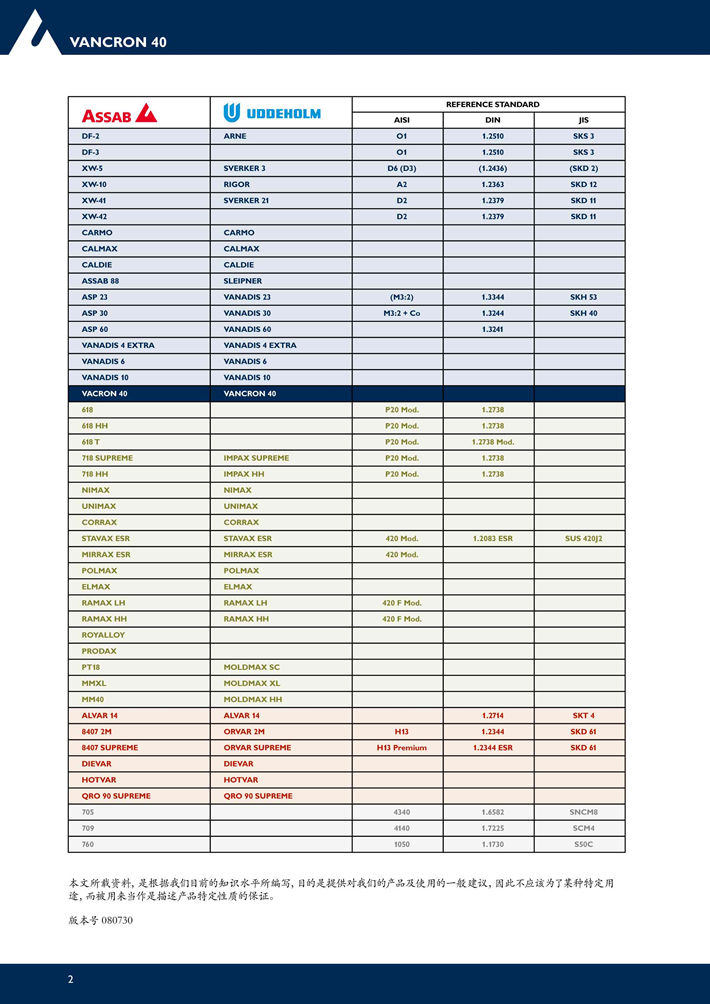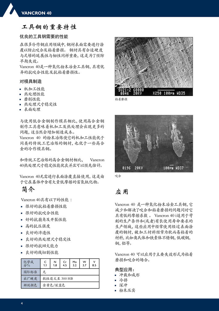 瑞典進(jìn)口V40(VANCRON 40)粉末高速鋼:富氮的粉末冶金模具鋼,具有非常好的抗粘著和抗粘著磨損性能,通常不必做涂覆。
